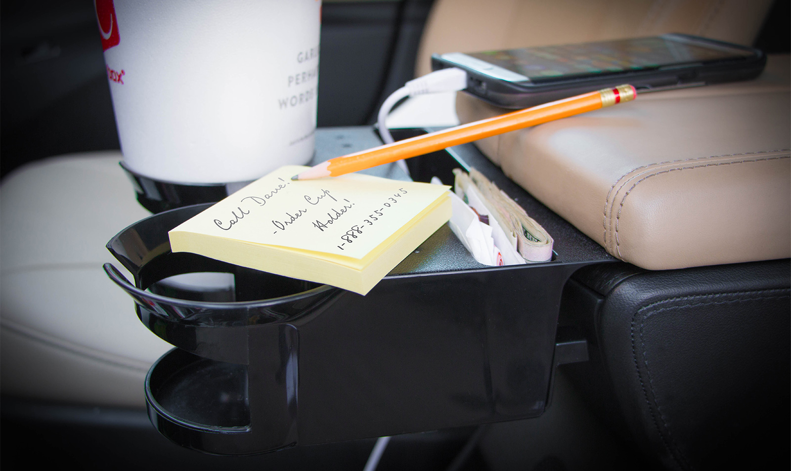 The Tesla Cup Holder has a molded in slot where you can easily keep a pen and paper handy. The slot on the Tesla Cup Holder has been designed with pen/pencil holder holes, power charger holes to allow a phone to be charged while in the compartment and more!